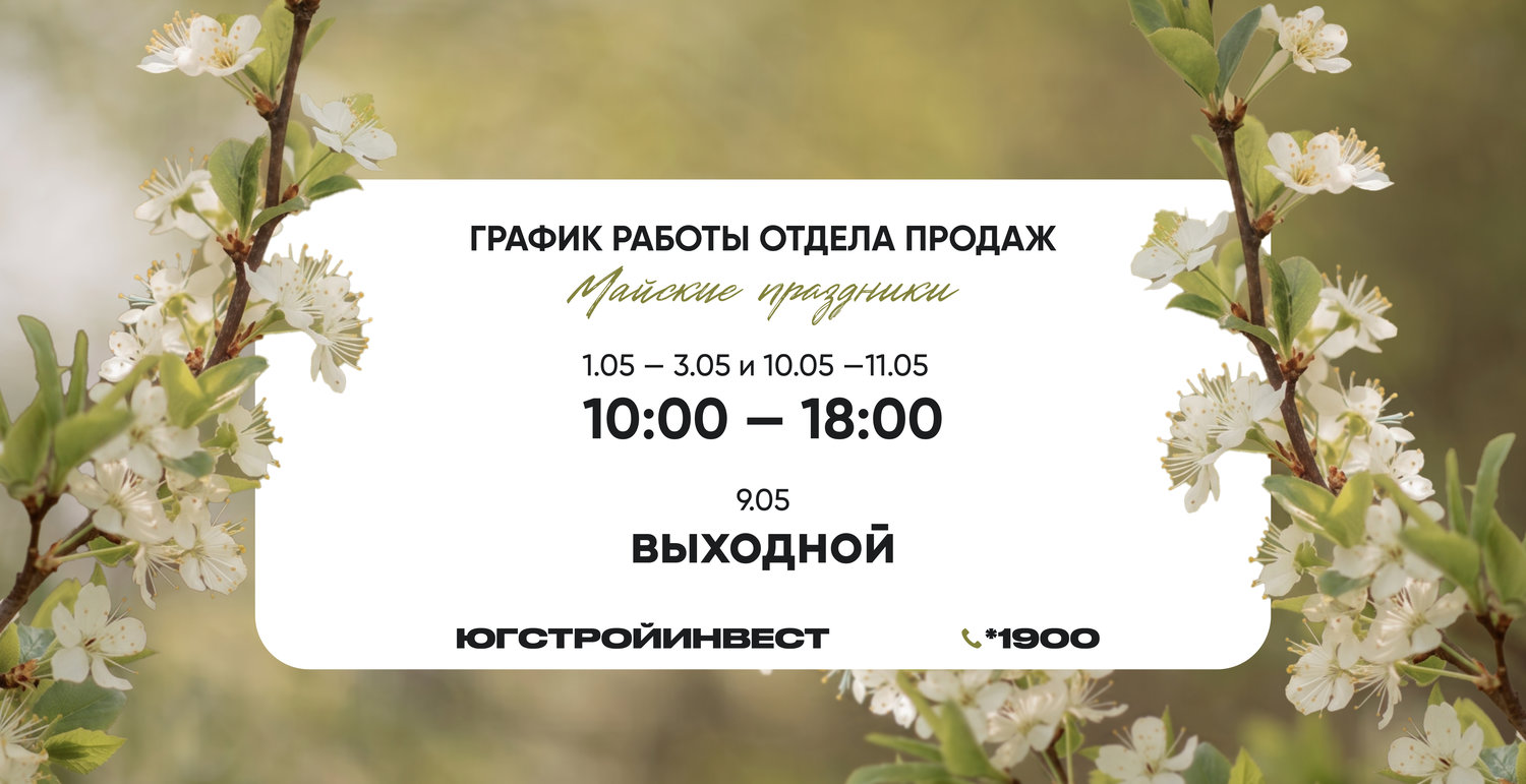 В майские праздники офисы продаж ГК «ЮгСтройИнвест» будут работать по следующему графику: